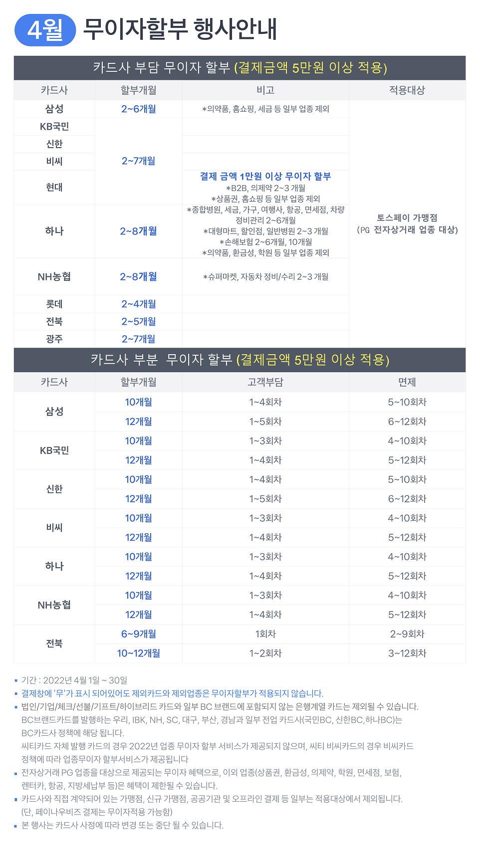 4월 신용카드 무이자 할부 안내입니다. 관리자 2022-04-04 13:45:15 5,440 main_banner_PopUp.png 4월 신용카드 무이자 할부 안내입니다. https://pgweb.tosspayments.com/tosspayments/MainPopUp.do 3월 신용카드 무이자 할부 안내입니다. 2022-03-10 16:34:05 List