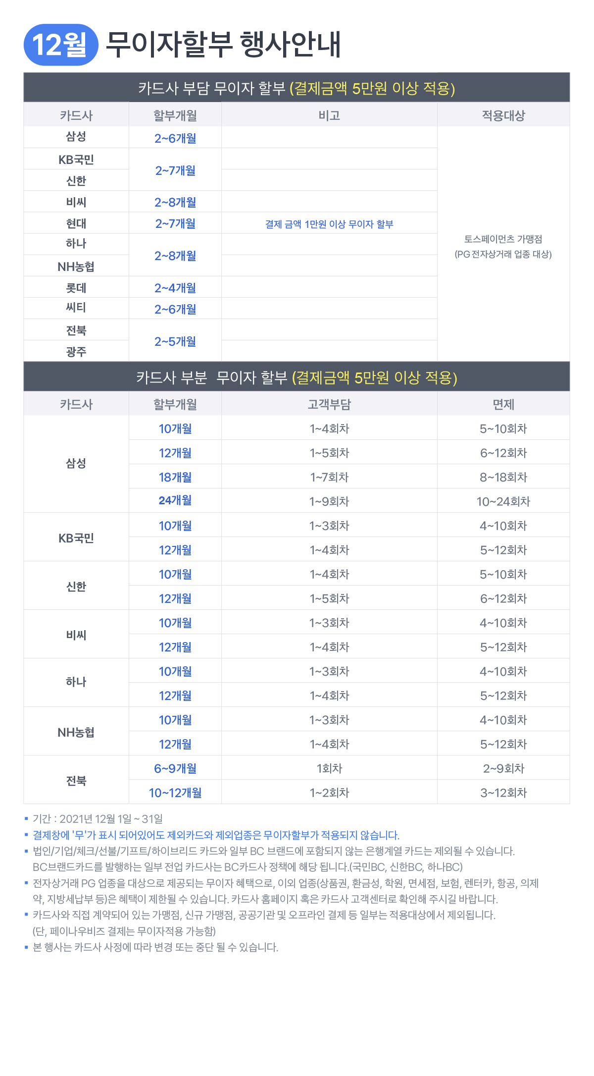 12월 신용카드 무이자 할부 안내입니다. 관리자 2021-12-01 12:10:47 5,348 main_banner_PopUp.png 12월 신용카드 무이자 할부 안내입니다. https://pgweb.tosspayments.com/tosspayments/MainPopUp.do 11월 신용카드 무이자 할부 안내입니다. 2021-11-10 13:03:40 List