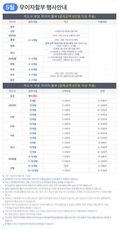 5월 신용카드 무이자 할부 안내입니다. 관리자 2023-05-11 09:11:33 4,299 main_banner_PopUp.png 5월 신용카드 무이자 할부 안내입니다. https://pgweb.tosspayments.com/tosspayments/MainPopUp.do 4월 신용카드 무이자 할부 안내입니다. 2023-04-04 10:01:01 List